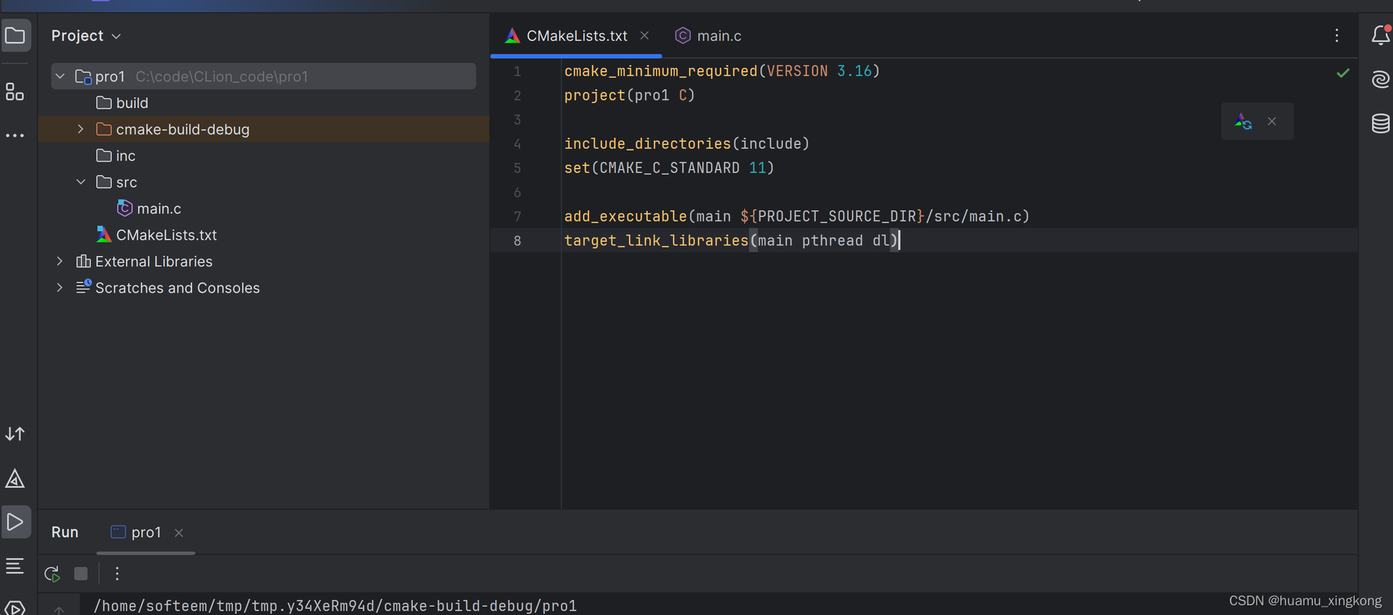 cmake_minimum_required(VERSION 3.16) project(pro1 C) include_directories(include) set(CMAKE_C_STANDARD 11) add_executable(main ${PROJECT_SOURCE_DIR}/src/main.c) target_link_libraries(main pthread dl)